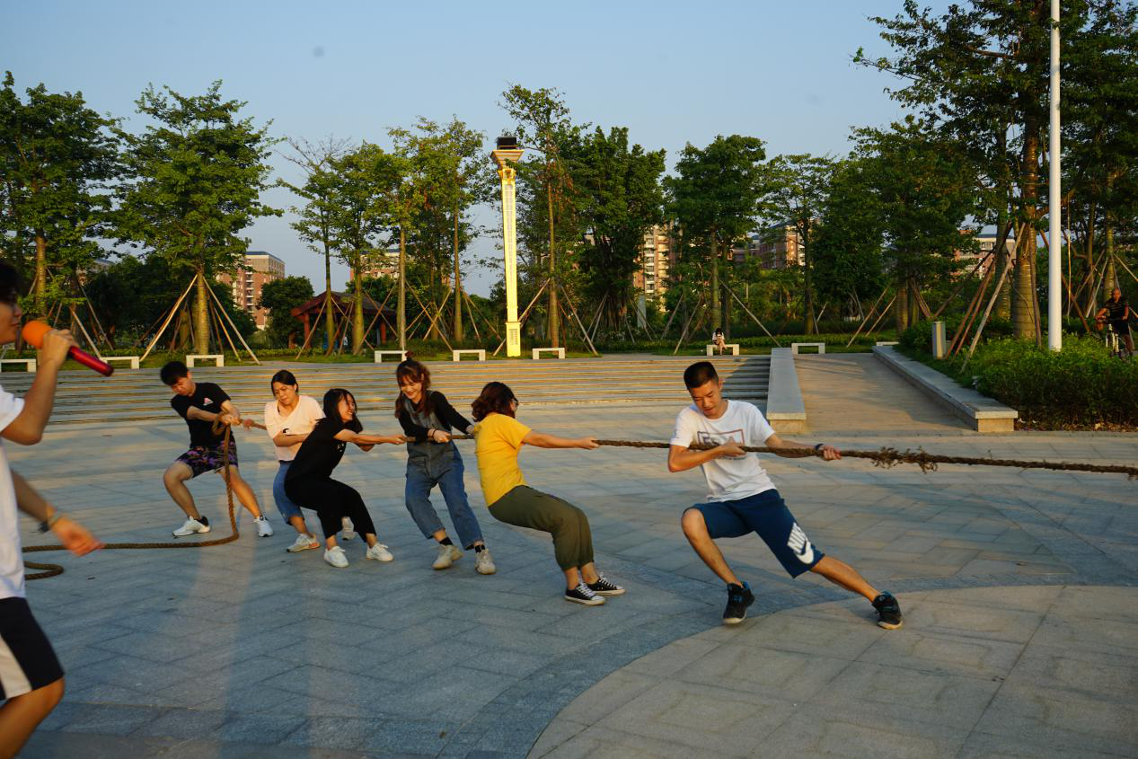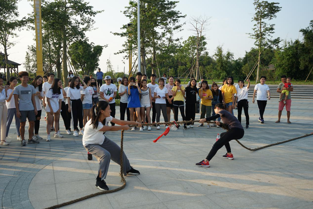 最后一项游戏,也是全场最为激动的比赛--拔河赛。比赛顺序按抽签决定,各队全部成员均要求参与到比赛中。团委书记邢佳佳老师及学生会指导老师夏仲老师两人十分顽皮地拿起绳子进行PK.干事们纷纷变为不明真相的吃瓜群众,为两位老师的对决加油呐喊。