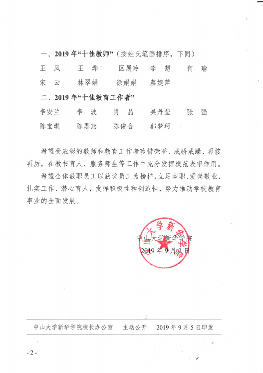 根据《关于开展2019年“十佳教师”和“十佳教育工作者”评选活动的通知》(中新人事〔2019〕13号)文件要求,经个人申报与单位推荐,人事处、教务处、学科与科技管理处审核、全校师生网络投票、信息与网络管理处统计票数等程序,学校评选领导小组评议会评议,校长办公会审定,入选中山大学新华学院2019年“十佳教师”的教师有9位,入选中山大学新华学院2019年“十佳教育工作者”的教师有9位。