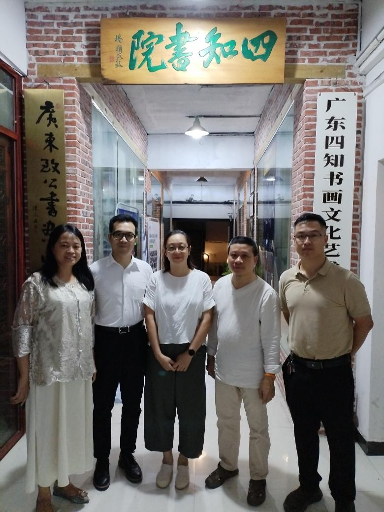 四知书院负责人杨朔明(右二)、项目负责人符琳(右三)、刘荣宏副董事长(左一)、3044永利集团官网执行院长廖益清(左三)、学生第一党支部书记马丽(左二)来访合影