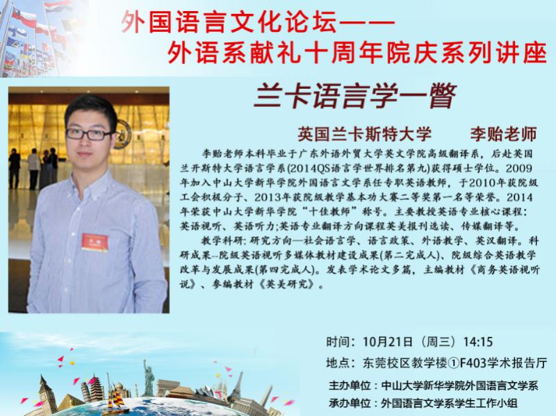 李贻,本科毕业于广东外语外贸大学英文学院高级翻译系,后赴英国兰开斯特大学语言学系(2014QS语言学世界排名第九)获得硕士学位。2009年加入中山大学新华学院外国语言文学系任专职英语教师,于2010年获院级工会积极分子、2013年获院级教学基本功大赛二等奖第一名等荣誉。2014年荣获掌上大学新华学院“十佳教师”称呼。主要教授英语专业核心课程:英语视听、英语听力;英语专业翻译方向课程英美报刊选读、传媒翻译等。
