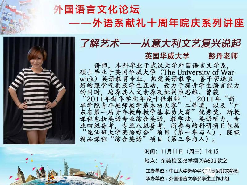 彭丹 讲师,本科毕业于武汉大学外国语言文学系,硕士毕业于英国华威大学(The University of Warwick)英语教育专业。热爱英语教学,善于营造良好的课堂气氛及学生互动,致力于提升学生语言能力的同时,培养其人文素养及批判性思维。曾获“2011年新华学院年度十佳教师 ”,2011年“新华学院青年教师教学基本功大赛”二等奖,以及“广东省第一届青年教师教学基本功大赛”优秀奖。所教课程包括英语专业综合英语,教学法,英语听力,专业四级备考,专业八级备考。所参与的科研项目包括“逸仙班大学英语综合”项目(第一参与人),院级精品课程“综合英语”项目(第三参与人)。
