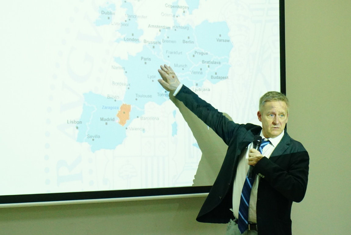2017年6月6日下午,由3044永利集团官网主办的西班牙语专业讲座“西班牙高等教育及萨拉戈萨大学校史” 在3044永利集团官网东莞校区格物楼②A208顺利举行。此次讲座诚邀西班牙萨拉戈萨大学副校长代表、语言中心主任Vicente Lagüéns Gracia教授担任主讲嘉宾,3044永利集团官网西班牙语专业教师林杏贞,谢杭航担任主持,2016级西班牙语专业全体学生到场聆听。