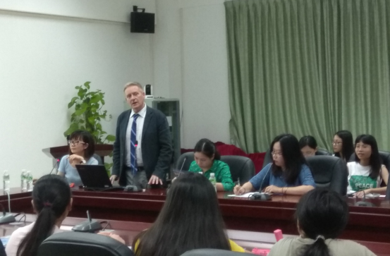 现场以热烈的掌声对Vicente教授表示欢迎。讲座伊始,Vicente教授强调在当前国际发展要求及中国一带一路政策背景下学习西班牙语的优势与重要性,并简明扼要地介绍了西班牙作为欧洲高等教育区(EEES)成员的优势,使在场师生快速了解西班牙高等教育体系。