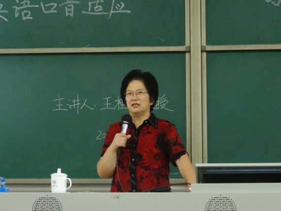王桂珍教授从口译译员的语言能力为切入点,全面解析了译员所应具备的个人素质与基本要求。王教授通过模仿一段来自八个国家不同口音的英语,生动地向在座师生展示出英语的地方方言、口音以及地区性的英语差异。此外,王教授还列出不列颠群岛、北美以及南半球等不同国家的英语差异,使在座师生大开眼界。王教授认为,要想做一名合格的译员,必须设定好一个目标并付诸实践,抓住重点多听多练,并熟悉不同地域中英语发音的规律及特点。