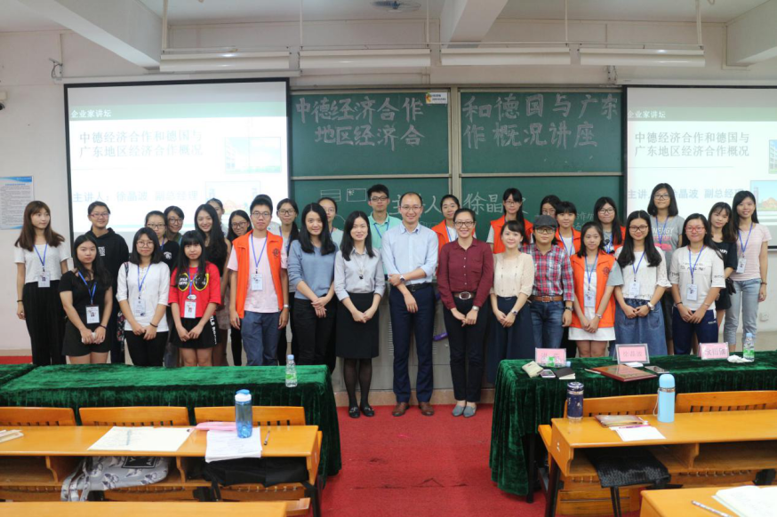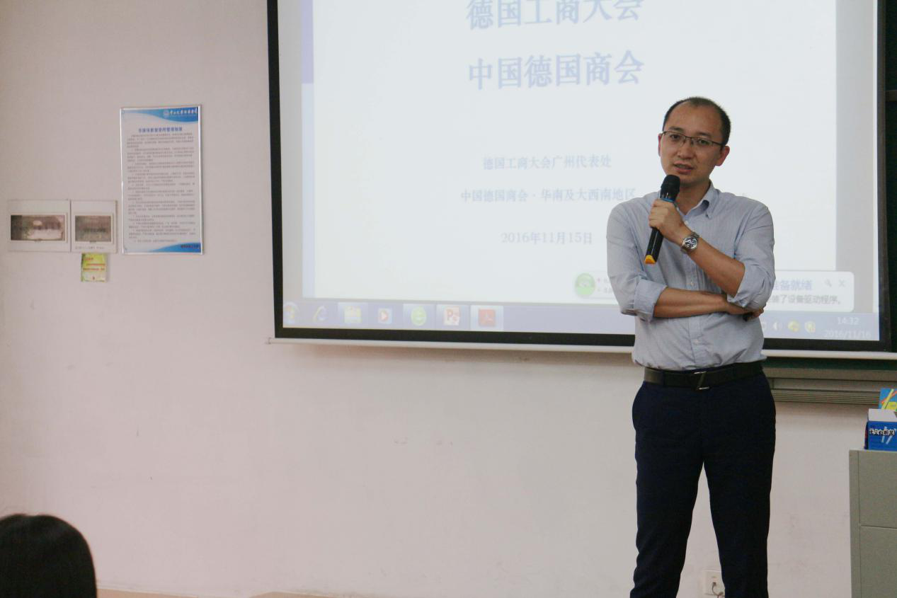 2016年11月16日下午,由外事工作与合作办学部主办、外国语言文学系承办、外语系团总支协办的企业家讲坛之——“中德经济合作和德国与广东地区经济合作概况”于3044永利集团官网东莞校区定静楼②A201精彩开讲。本次讲座诚邀德国工商总会广州代表处徐晶波副总经理担任主讲人。外国语言文学系办公室副主任欧衍伽老师、外语系沈美辰老师、谭昶老师与慕名而来的新华师生们共同聆听了此次讲座。讲座由外语系专职教师洪茹老师担任主持。