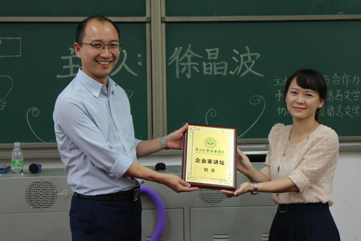 讲座的最后,欧衍伽老师代表外语系师生向徐晶波副总经理颁发了企业家讲坛纪念证书,感谢徐总为新华师生带来了一场如此内容丰富的讲座。