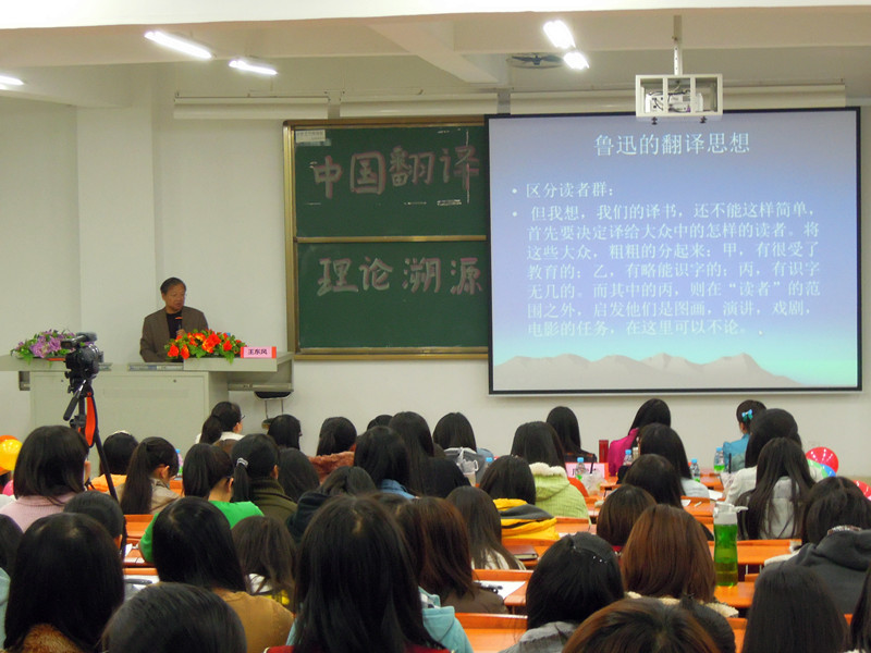 讲座伊始,支持人刘霞老师向在座的青年教师与同学们隆重地介绍主讲嘉宾王东风教授,随即同学们对王东风教授的敬畏之情油然而生。接下来,王教授用独特的见解介绍了中国历史上的三次翻译高潮:汉唐佛经翻译,明清时期的耶稣会士翻译、期末明初翻译理论。他引用古今中外的各位大师案例做讲解,从古佛经的四大皆空到近代严复的思想理论,从梁启超的今文翻译到道安深刻艺术的文学思想。三次文学高潮皆贯穿古今中外各名胜古迹及文化案例,令人惊叹不已。王教授把翻译学的溯源讲得十分透彻,引领在场的教师与同学们走进中国翻译理论溯源的殿堂。最后,在问答环节中同学们更是表现踊跃,接二连三的问题都被王教授用自己渊博的知识专业地为同学们答疑解惑,赢得老师和同学们阵阵热烈的掌声和油生的敬佩之情。