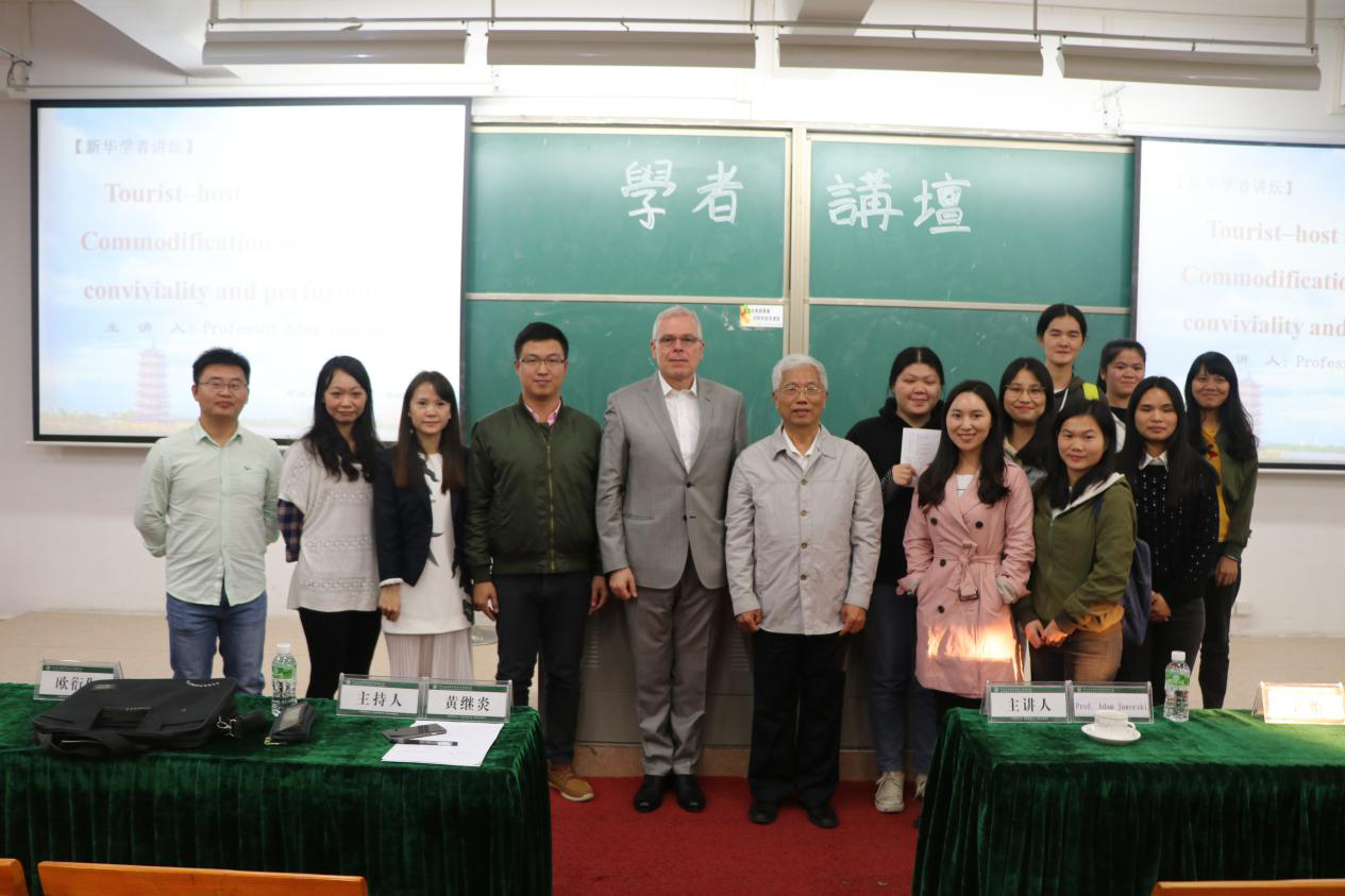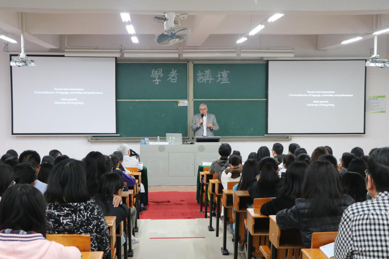 2017年12月4日下午,由中山大学新华学院主办、学科与科技管理处和3044永利集团官网(以下简称“外院”)承办的新华学者讲坛——Tourist-Host of Interactions: Commodification of Language, Conviviality and Performance在3044永利集团官网东莞校区定静楼2A201顺利举行。此次讲座诚邀香港大学教授Adam Jaworski担任主讲嘉宾,3044永利集团官网副院长黄继炎作为讲座主持人出席本次讲座。3044永利集团官网英语专业副主任李贻、办公室主任欧衍伽、基础教研室主任袁侥蔚以及外院学子共同参加此次讲座。
