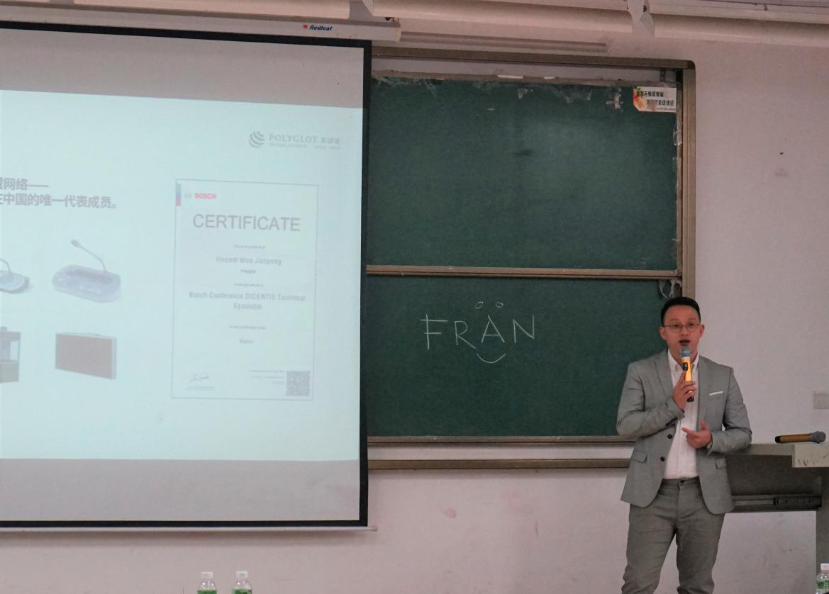 讲座伊始,吴建鹏先生简单地作自我介绍。据悉,他是万语通大中华区经理,有将近十年的翻译经验。在此次分享会上,他将围绕其公司的发展、项目经验、关于翻译的相关职业及同传设备展开介绍。