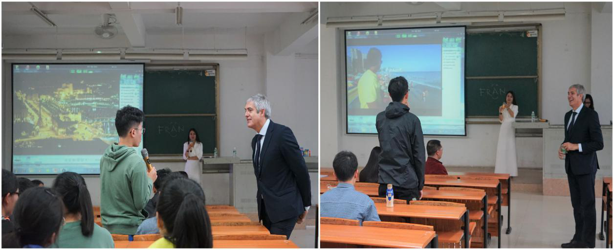 在自由提问环节中,同学们积极提问,。法兰古兹曼先生耐心地解答。法兰古兹曼先生推荐,同学们有机会可以去西班牙撒哈拉港的大学城。因为对中国学生来说,那里是一个很好的留学城市,同学们或许会开启一场更丰富的人生。