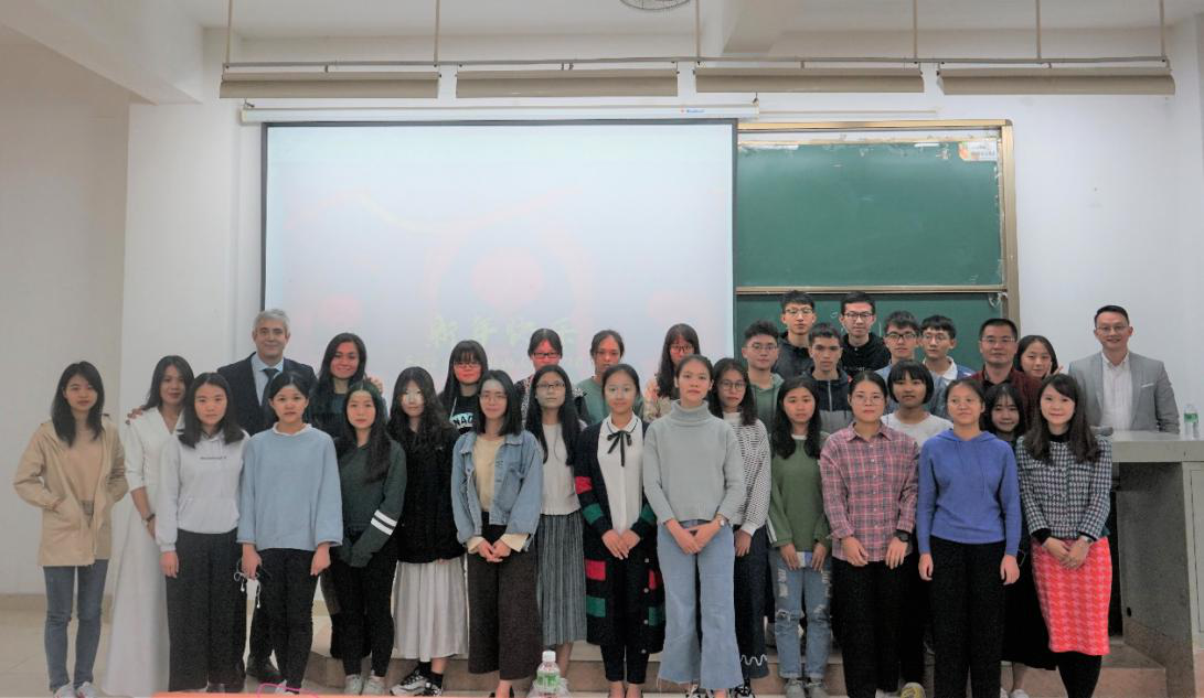 2018年12月23日下午,由中山大学新华学院3044永利集团官网主办的企业家讲坛---“中国与西班牙友好合作与交流”于定静楼1-D202精彩开讲。本次讲座由西班牙企业家法兰古兹曼先生担任主讲人。3044永利集团官网副院长李向奇,党支部副书记欧衍伽及3044永利集团官网学子参加了此次讲座。