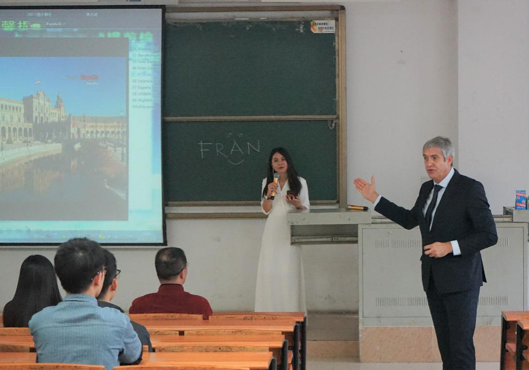 紧接着,法兰古兹曼先生通过视频展示了西班牙各色各样的美食、充满历史与现实味道的建筑、独特的历史文化风情等,把在座师生带进了西班牙这个奇妙的国家。据法兰古兹曼先生介绍,西班牙有着“一山一海一城”的特点,作为一个拥有渊源历史的国家,人们一定会在西班牙感受到快乐。在夹杂着法兰古兹曼先生幽默语言的讲解中,现场气氛轻松愉悦。