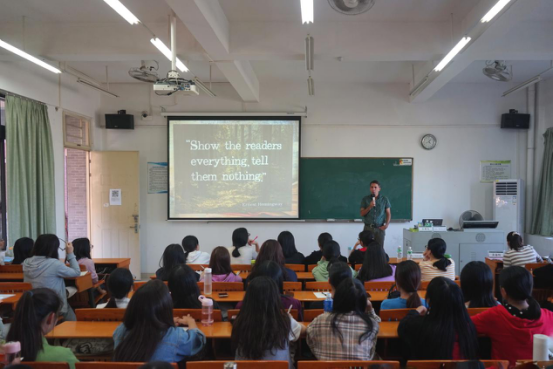 10月29日下午,2019中山大学作家写作营“中大新华行”系列讲座于3044永利集团官网东莞校区同期举办。其中英文讲座《Finley MacDonald: Fiction-Writing Modes: How to “tell” successfully 写作模式:如何有效“讲述”》于定静楼②-B301开设,吸引了众多学生前来参加。本次讲座诚挚邀请Finley MacDonald担任主讲人,英语专业翻译教研室主任黄越悦主持。