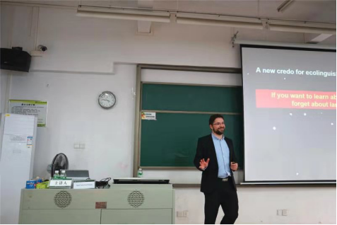 本次讲座,Steffensen教授向大家介绍了生态语言学的学术前沿理论,通过列举生态语言学发展进程中各位语言学家的观点,介绍在语言学领域中语言与环境之间的相互作用,深入浅出地为在场师生解释生态语言学的焦点问题之一,即言语行为如何对环境产生影响,以及环境对语言的反向作用。Steffensen教授把语言学研究和语言交流放在生态环境的背景下进行理解,揭示语言体系中的生态规律,生动地讲述了生态语言学的各种有趣知识点,深入人心,讲座气氛活跃。讲座最后,现场师生还展开了问答环节,Steffensen教授也根据同学们提出的疑问和想法给予了耐心且细致的回答。学生们纷纷表示受益匪浅。此次讲座圆满举行。