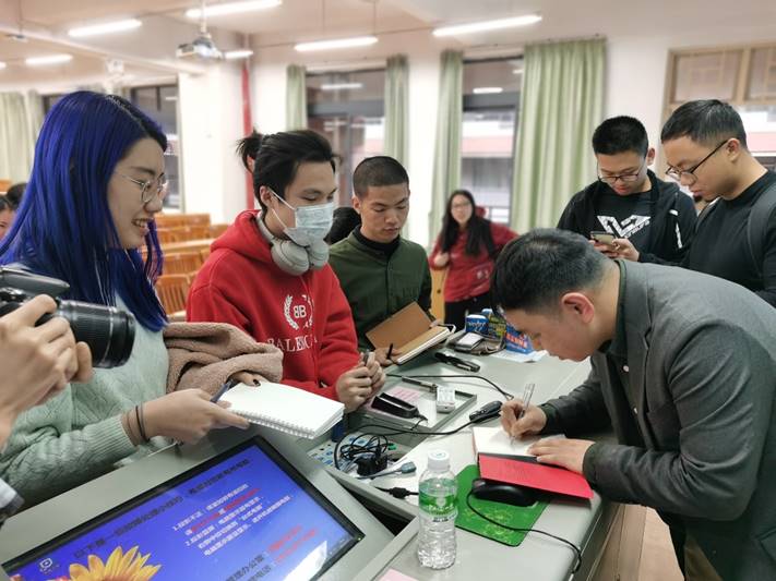 问答环节,观众踊跃提问,詹教授也对口译实践的乐趣和口译研究趋势都一一做了详细解答。讲座结束后,在场观众被詹教授的实力与魅力“圈粉”了,纷纷上前合影并请詹教授签名留念。