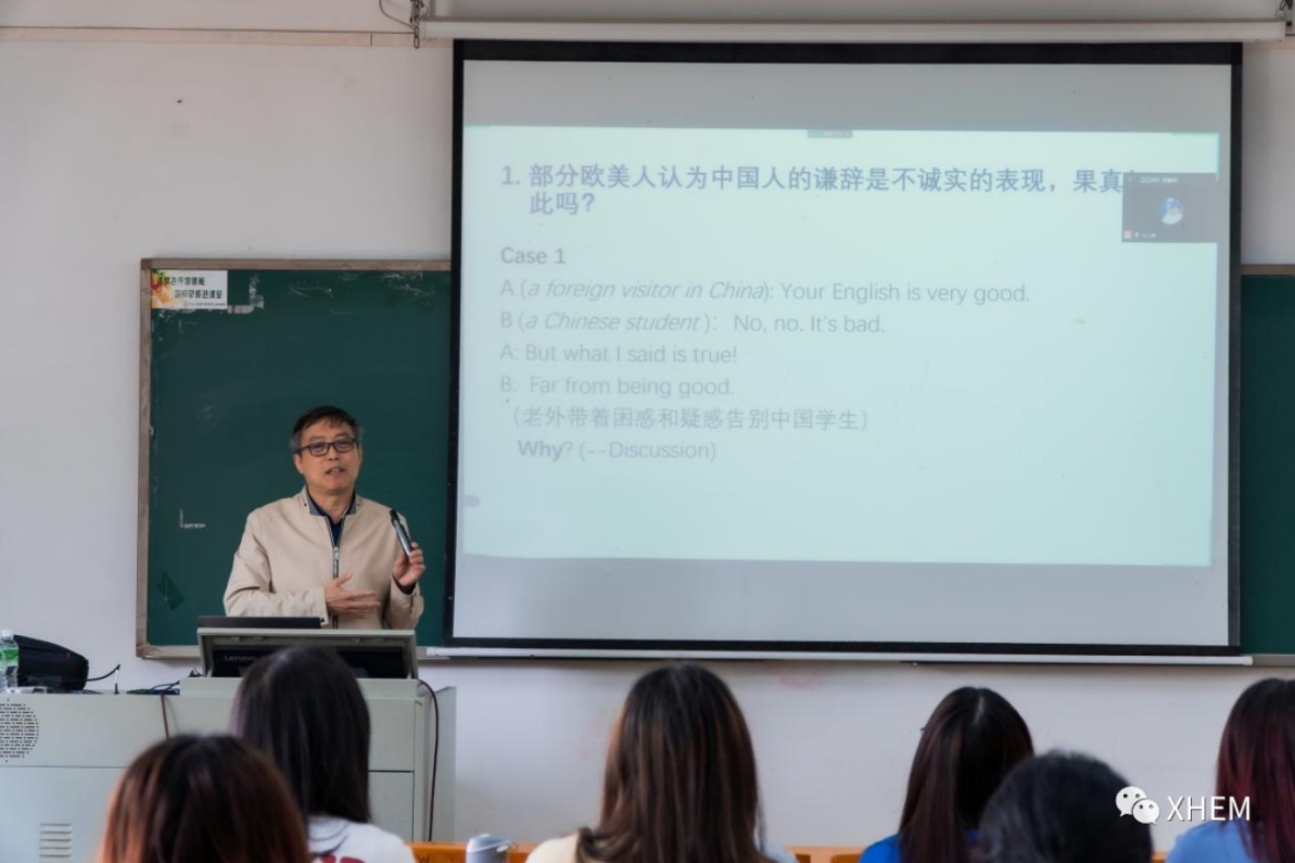 首先,牛教授用一段简单的英文对话引发同学们的思考:部分欧美人认为中国人的谦词是不诚实的表现,果真如此吗?同学们对此进行了积极地思考与发言,最后牛教授指出:中国人的谦虚根源于我国传统儒家文化,在我国,谦虚谨慎是传统美德,但也只是在我国儒家文化背景下对谦逊会有这样共同的认识,在西方欧美众多国家中,谦逊有时会让他们觉得虚伪或不诚实。在场的同学们听后都受益匪浅。接着,牛教授引用“1896年李鸿章访美”事件中,中美两国对李鸿章酒桌谦辞的不同态度,进一步为同学们展示了中国人与外国人交流中存在的差异。