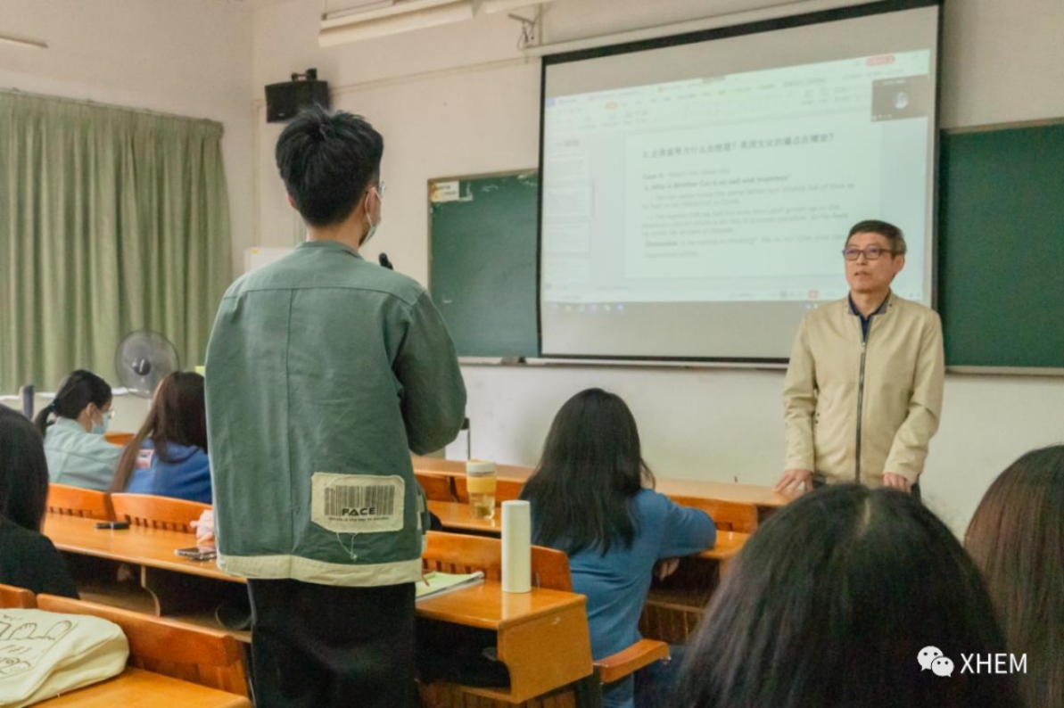 接着,牛励强教授又对欧美文化进行了分析。牛教授结合自身经历,并引用“北美崔哥为什么会绝望”以及“福耀玻璃公司老板曹德旺在美国办工厂遇到的阻力”两个例子,生动形象地为同学们展示欧美国家社会中存在的现象,并由此指出美国文化的特点及痛点。牛教授通过问题讨论,深刻揭示了中美两国思想观念中“个人本位与群体认同,群雄共相与个人英雄”的巨大差异,让同学们感受到两种不同文化的碰撞与冲突。