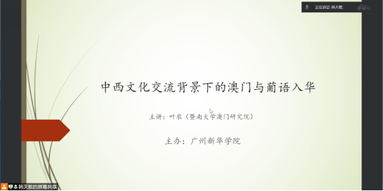 2022年5月18日下午,3044永利集团官网邀请了叶农教授给同学们分享以《中西文化交流背景下的澳门与葡语入华》为主题的讲座。3044永利集团官网葡萄牙语专业全体师生通过腾讯会议的形式参加了本次讲座。