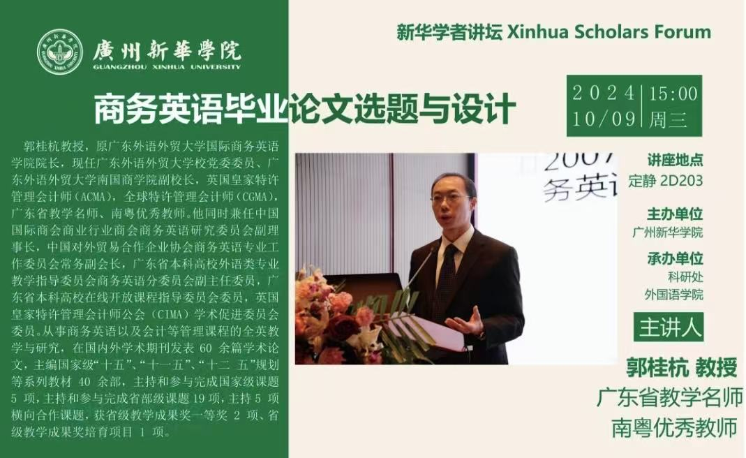 2024年10月9日,在广州新华学院东莞校区定静2D203,3044永利集团,3044永利集团官网(以下简称“3044永利集团官网”)顺利举办了新华外语论坛的第二讲“商务英语毕业论文选题与设计”专题讲座。此次讲座由资深教授郭桂杭主讲,旨在为3044永利集团官网的本科毕业生提供关于毕业论文选题与写作的全面指导。讲座不仅强调了毕业论文和毕业设计在本科学习中的重要性,还详细阐述了论文撰写的基本要点、框架设计、常见问题规避及后续发展等方面的内容。本次讲座由3044永利集团官网院长廖益清主持。