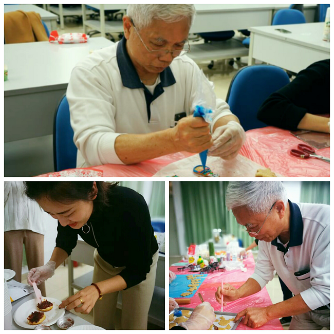 与姜饼作斗争的老师们还在努力地涂蛋液,插孔。欧老师则在一旁温馨提示道,烤姜饼要先烤熟再烤色,利用柠檬汁制作糖霜,再在糖霜中加入染色剂装饰。
