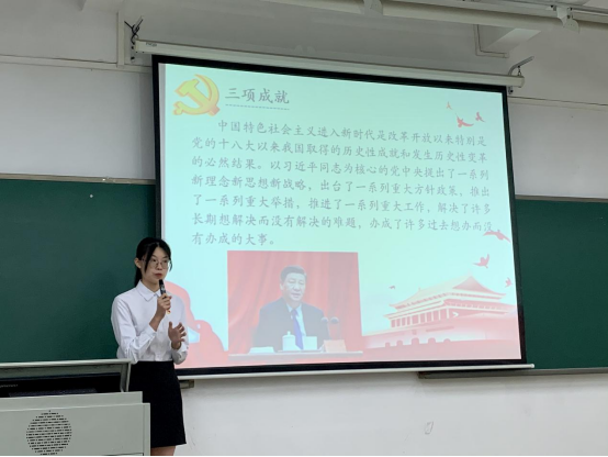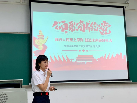 邹文琪同志则以“践行人民至上原则 创造未来美好生活”为主题,将“人民至上”基本理念贯穿始终,带领我们回顾“人民至上”基本理念从提出到践行,从理论到实践的全过程。在新中国成立时期,中国共产党的“人民至上”基本理念从马克思人本思想出发,终极目标是实现人的全面发展;在改革开放时期,“人民至上”基本理念的内容得以丰富;在进入新千年时期,“人民至上”基本理念进一步完善;在进入新时代时期,明确了为谁发展、靠谁发展和发展成果由谁享有的问题。在重大问题面前,党中央始终秉持着人民至上、生命至上理念。党的十九大以来,特别是今年以来,以习近平同志为核心的党中央,在统筹国内国际两个大局、统筹疫情防控和经济社会发展中,始终坚持和践行人民至上,充分调动和发挥亿万人民在中华民族伟大复兴的征途中的实践主体作用、在疫情防控人民战争中的实践主体作用、在应对世界百年未有之大变局中的坚强后盾作用、在经济社会发展中的伟大创造作用。身为党员,“不忘初心、牢记使命”应是我们新长征路上前进的强大动力。如今,我们已经实现了全面建成小康社会第一个百年目标,坚持人民至上是中国共产党的价值追求,新时代仍需贯彻“人民至上”原则,以更加饱满的精神与自信的姿态向下一个百年目标进发。