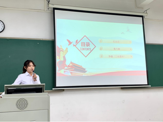 邹雅燕同志以“汇聚青年力量,点亮红色中国”为主题,首先从回顾革命历史,传承先辈精神入手,以爱国革命运动为例,讲述了一批我们熟知的先进知识分子和革命青年用行动身体力行,在追求真理中传播新思想新文化,冲击了几千年来的封建残余的历史。接着,她从三大精神,即爱国精神、航天精神和抗疫精神作为切入点,向我们展示了当代英雄的形象。一代人有一代人的长征路,一代人有一代人的使命与担当。不论是百年前的长征,亦是当今疫情当头的长征,都传递了一股青年干劲。作为青年一代,奋斗是青春最亮眼的底色,行动是青年最有效的磨砺。我们应该向革命先辈学习,向当代榜样学习,争做“三有”青年,为点亮中国梦而努力奋斗!