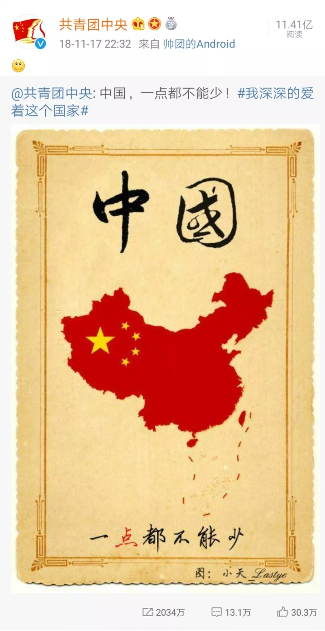 “中国,一点都不能少!”2018年11月的一个夜晚,微博上瞬间沸腾了。当 @共青团中央 发出这条微博,短短几小时内便获得了众多网友的转发、评论、点赞,有力回击了“台独”分子的分裂言论,坚决支持祖国统一大业。