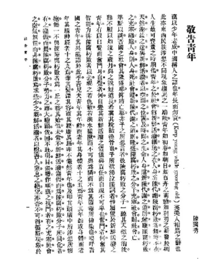 “青年如初春,如朝日,如百卉之萌动,如利刃之新发于硎,人生最可宝贵之时期也。青年之于社会,犹新鲜活泼细胞之在人身”……1915年9月创刊的《青年杂志》上,一段热情洋溢的文字展现在世人面前。在这篇名为《敬告青年》的发刊词中,陈独秀满怀激情地讴歌青年的重要性,呼唤青年“自觉其新鲜活泼之价值与责任”,号召青年“奋其智能,力排陈腐朽败者以去”。