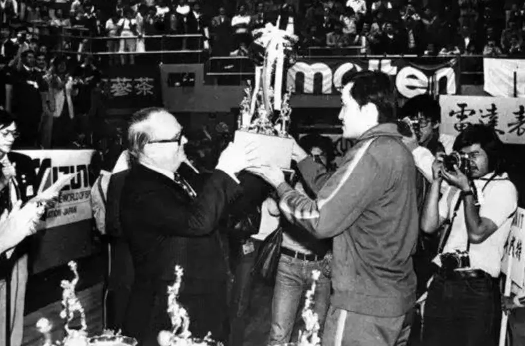 ▲1981年3月20日,中国男排队长胡进接受冠军奖杯