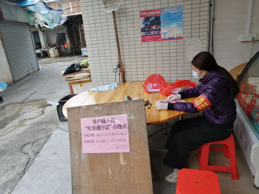 在我为期三天的志愿活动里,便遇上今年第一次大寒潮。倾盆而下的大雨,侵入骨髓的寒风让人瑟瑟发抖。我也遇见了一户户前来办理“生活通行证”的房东,他们井然有序,互相之间默契地不说一句话,防止病毒传播。我也在无声的世界里,细心地为他们服务,认真地核对他们的信息。面对外来人员的疑惑,我也认真而简洁的跟他们解释所有有关通行证的事宜。每天早上八点到下午六点10个小时的工作时间中,因为工作的繁杂,我并没有休息时间。每天急急忙忙地吃上几口社区人员送给我的饭菜,便接着继续为村民办理通行证件。15日的晚上,由于复工潮的到来,大批租客的归来,我和大伯不得不工作到十点才下班。