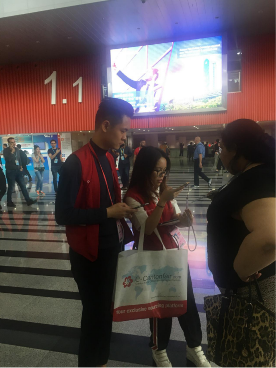 两天后,同学们终于来到了梦寐以求的广交会展馆,正式展开一天的工作,工作内容包括为采购商指引方向、帮助其解决沟通问题和一些突发状况。由于大多数采购商是第一次参加广交会,为了节省时间,提高采购效率,大家向采购商们推荐了广交会官方App,以便在上万参展商中迅速定位并在第一时间与其取得联系,发出询盘。“翻译官”们在提供基础的翻译服务的工作的同时,也在竭尽全力解决外商们遇到的问题。