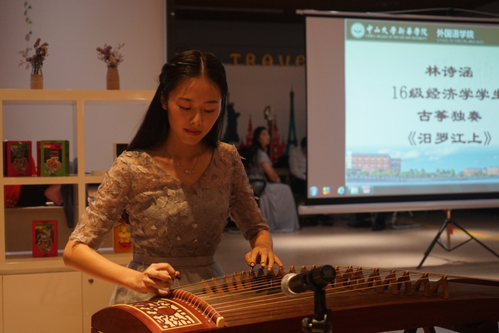 朗诵会上,学校还精心安排了精彩的现场乐器表演。2016级经济学专业林诗涵同学表演的古筝独奏作品《汨罗江上》和16级财管学生肖钰婷表演的琵琶独奏《送我一只玫瑰花》均体现了中国古典音乐的丰富内涵,令在场听众拍手称赞。17级计算机学生赵祎轩表演的萨克斯独奏《小查尔达什协奏曲》及16级财管学生黄康泰表演的吉他独奏《Sliver Wind》则体展现出中大新华学子在学习乐器的过程中兼容并包、极具国际化的一面。