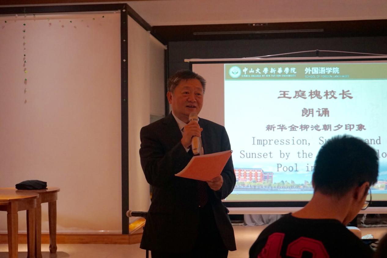 王庭槐校长开场致欢迎辞并深情朗诵个人诗歌作品《新华金柳池朝夕印象》