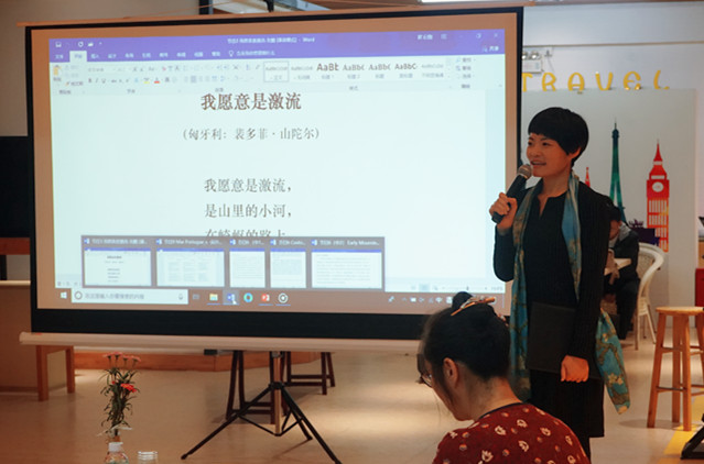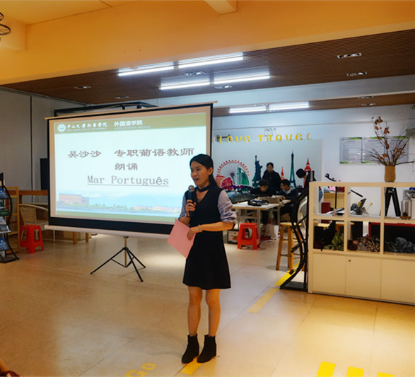 来自中山大学的刘鹏老师见此情此景,不禁深深着迷,当场朗诵了裴多菲的《我愿意是激流》。她的朗诵声情并茂,将整场朗诵会带入高潮。3044永利集团官网谭昶老师、吴莎莎老师和黄垚馨老师也相继在朗诵会上分享了Give Me Some Light、Mar Portugues和Yo voy soiando camino三首诗歌,赢得在场阵阵掌声。