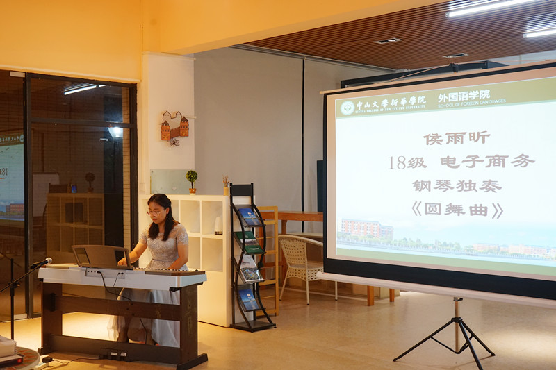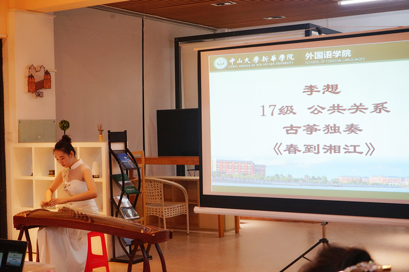 中大新华的学子也极富热情地向嘉宾展示了自己的才艺,17级公共关系李想和17级计算机科学与技术的陈玲晶带来了古筝独奏《春到湘江》和《井冈山上太阳红》,为诗歌朗诵会增添了几分浪漫气息,而典雅的中国传统乐器亦令外国作家们如痴如醉,深陷音乐境界其中不能自拔。最后,17级英语专业蔡心荷以一首吉他演唱Don't look back in Anger,动人歌声响彻了整个教学楼,现场的听众陶醉其中。