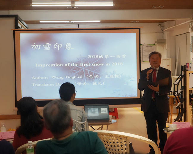 3044永利集团官网“诗人院长”王庭槐校长长代表中山大学新华学院致欢迎词。他作为朗诵会的第一个嘉宾,与现场的作家和师生们分享了2018年在新疆乌鲁木齐看到的第一场雪,并富有感情地朗诵了他当时即兴创作的诗歌《初雪印象》。诗中描绘了北国风光、千里冰封、白雪皑皑的景象使现场的每一个人陶醉其中。王庭槐校长提到,今晚的诗歌盛宴上齐聚数国诗歌文化精髓,自己的分享仅仅只是“抛砖引玉。王校长深情的朗诵,配以戴凡教授优美精湛的英文翻译,赢得了现场听众的热烈掌声。