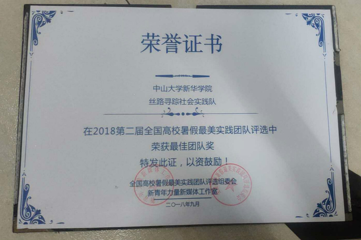 2018年9月,3044永利集团官网“丝路寻踪”社会实践队荣获由全国高校暑假最美社会实践团队评选委员会以及新青年力量新媒体工作室颁发的“最佳团队”荣誉证书,为本年度外院“三下乡”社会实践活动增添了最绚烂的一笔。