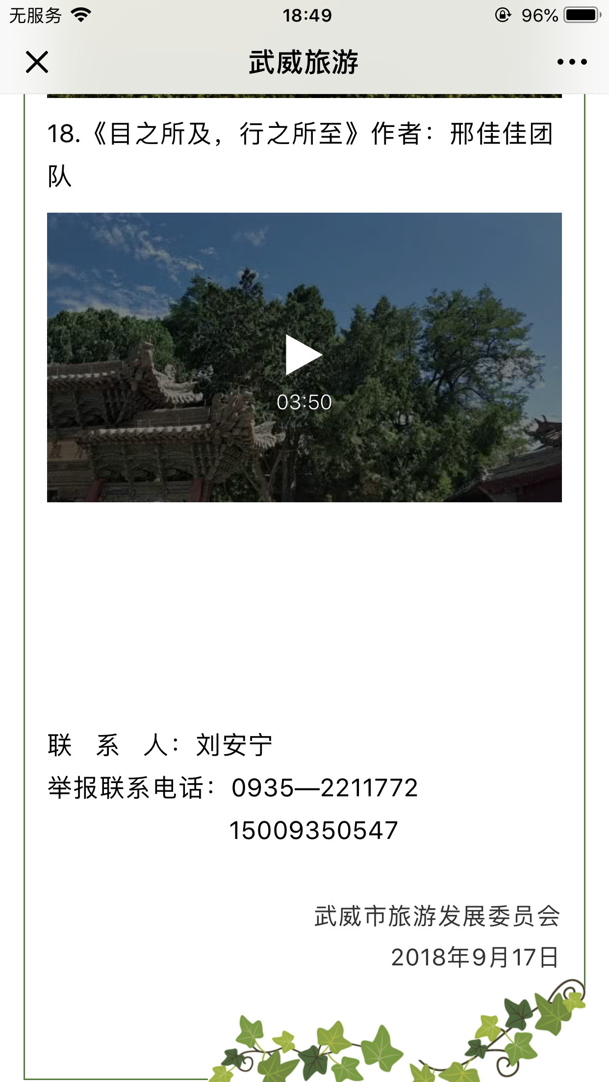 团队作品《目之所及,行之所至》微视频被发布在武威旅游公众号