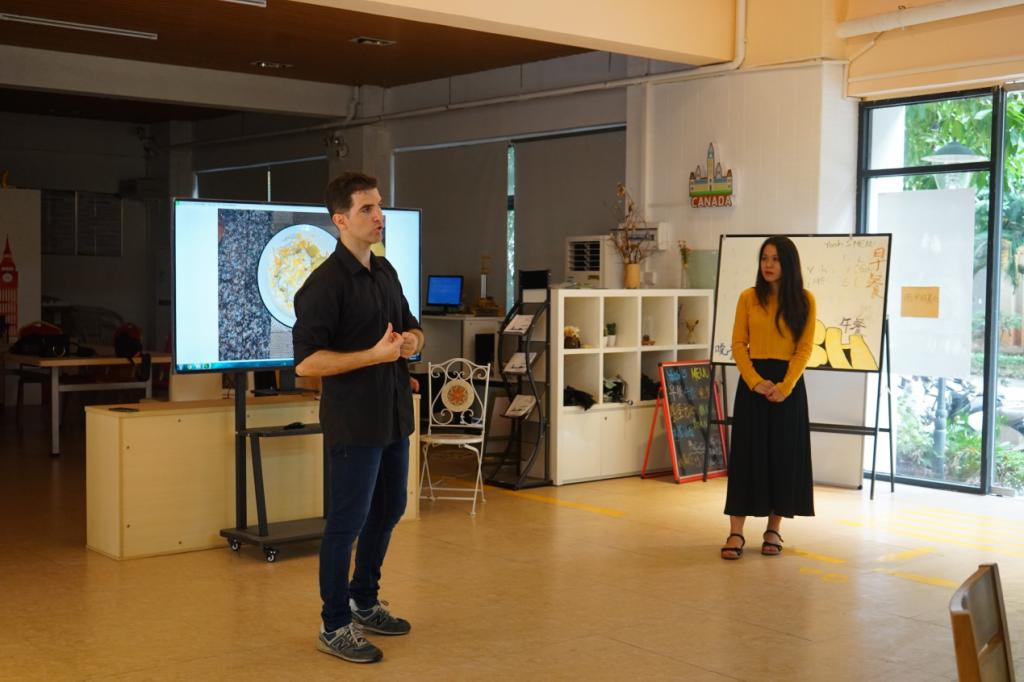 Rubén(左)介绍西班牙饮食文化、黄垚馨博士(右)担任翻译