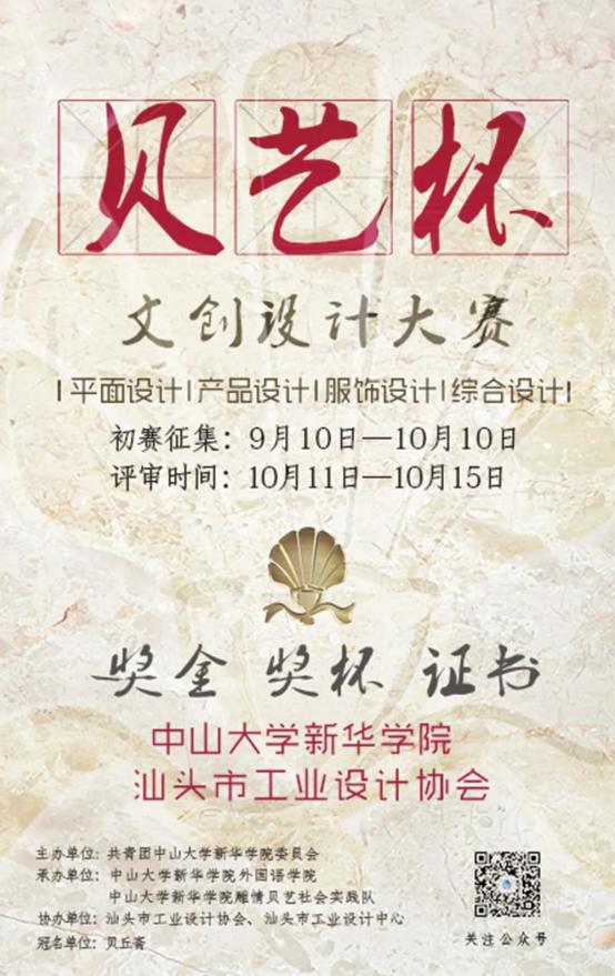 2019年9月,“贝艺杯”文创设计大赛将由中山大学新华学院与汕头市工业设计协会共同举办,并由贝雕收藏家卢湘莹女士创立的贝丘斋冠名支持。此次比赛将面对在校大学生,以“潮汕贝雕”为核心,以“贝”为主要创作元素。