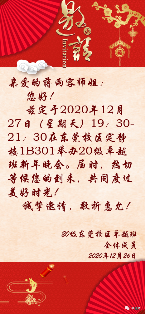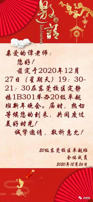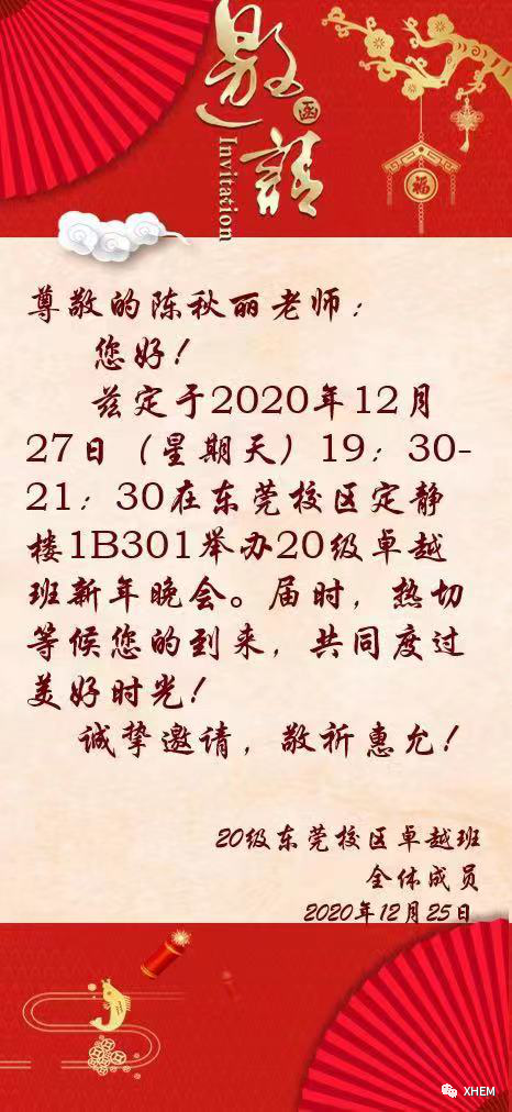 回首过往,虽然我们经历各不相同,虽然我们来自五湖四海,可同在九月,我们来到中大新华,也在九月,我们三十六人,相遇了!尽管时光在悄悄流逝,可所幸,我们抓住了2020的尾巴,在12月18日晚上19:30东莞校区定静1B301开展了20级东莞卓越班第一次班会及新年晚会,在卓越班的邀请下,卓越班项目负责人陈秋丽老师,班导蒋雨容师姐、麦欣怡师姐出席了本次本会并发表了讲话。
