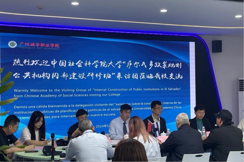 罗韩鑫作为西语翻译陪同西班牙人俱乐部工作人员前往公司开会(右一)