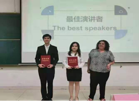 外教Luz(右)与最佳演讲者叶俊锋、麦子沄合影留念