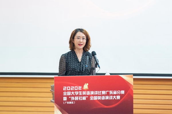 广东省教育厅高等教育处姜琳处长在致辞中感谢中大新华作为比赛承办方的精心筹备,为参赛选手提供优质的服务和良好的比赛环境。她认为,广东省大学生英语演讲比赛是广东省大学生教学英语方面不可多得的赛事,代表了广东省大学生英语演讲的最高水平,对英语教学的指导改革有着极大的推动作用。希望所有参赛选手借助这个舞台锤炼专业本领、锻炼实践能力,也希望英语专业人才培养能够依托该项比赛,强本领、长才干,涌现出更多自信发声的优秀英语人才。