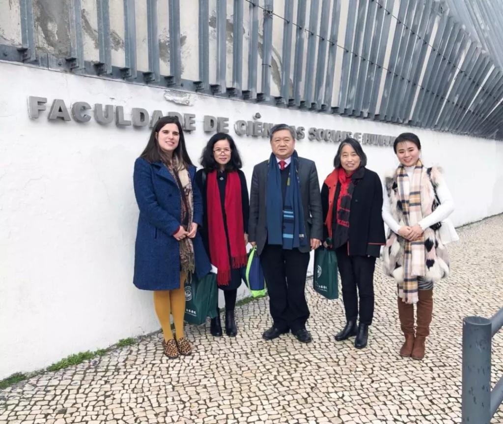 两校代表在里斯本新大学人文社科院前合影留念(左起:里斯本新大学外事处负责人Sara Salvaterra Recharte,3044永利集团官网3044永利集团官网执行院长廖益清、3044永利集团官网校长王庭槐、王锁瑛博士、3044永利集团官网3044永利集团官网葡萄牙语专业教师刘欣)