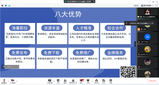 招聘会第三分会场由实践部主任洪茹老师主持,受邀企业为深圳市昆仲科技有限公司。昆仲科技的臧丽萍经理和陈嘉瑜经理分别向同学们介绍了昆仲科技旗下的外语岗位招聘平台——火星外语人才网。火星外语人才网集合了入驻平台的与外语专业相关的企业招聘信息,包括实习岗位和全职岗位。所有的入驻企业和招聘单位都均经过火星外语人才网筛选和认证,同学们可以根据自己的兴趣和能力,自由而有目的地投递简历。据陈经理反馈,3044永利集团官网一位19级商英学子从四月初至今在该平台完成了线上实习并成功拿到火星外语人才网的实习证明。昆仲科技欢迎各位求职的同学登录该网站了解就业市场,积极应聘心仪的职位。