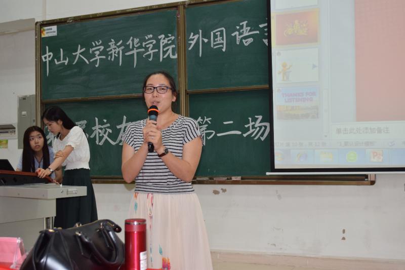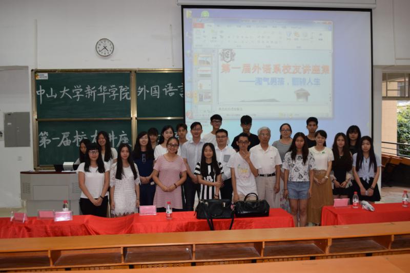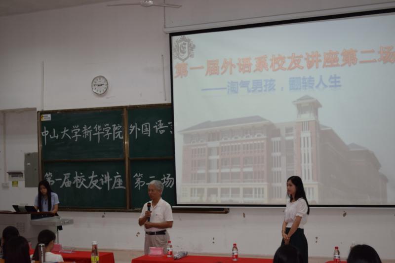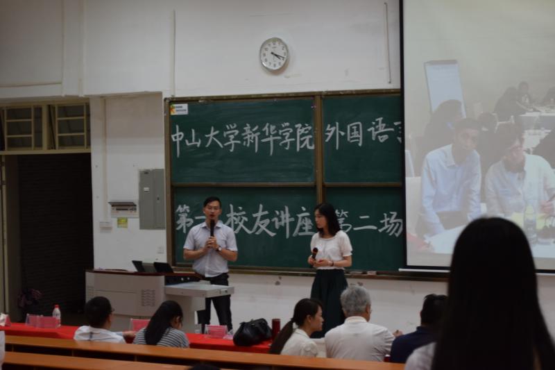 外国语言文学系于5月20日14:30在教2D203开展了校友系列讲座第二场——“淘气男孩 翻转人生”。本次讲座有幸邀请到05级黄敏华师兄和吴建鹏师兄来为大家开讲。本次莅临讲座现场的嘉宾有:外国语言文学系副主任兼办公室主任黄继炎副教授,院团委书记兼外语系05,06级辅导员殷丹老师,外语系办公室副主任欧衍伽老师以及外语系13级辅导员梅星星老师。讲座伊始,黄继炎主任上台致辞,对师兄们的归来表示热烈欢迎。