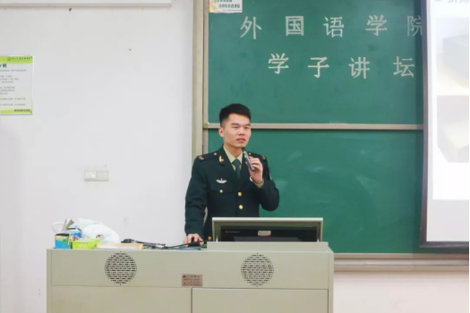 接下来,杨立成师兄以烈火淬炼,自强不息的人生为主题讲述了他拼搏军旅的时光。师兄用轻松幽默的语言,为我们讲述了他日常的队伍、射击、抗饿训练及武装越野等,同时告诉大家军旅生涯,将会是他一生难忘的经历。他优秀的军人气质和富有感染力的话语引发了同学们对军人的崇拜之情,迎来了阵阵雷鸣般的掌声。最后,师兄亦深情地说道:“穿上这份军装时,我是共和国的战士,脱下这份军装时,我只是一名普通的大学生。”
