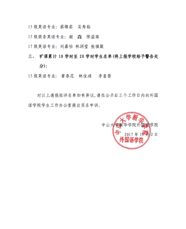 关于通报批评李星蓉等16名同学违反考勤条例的通知