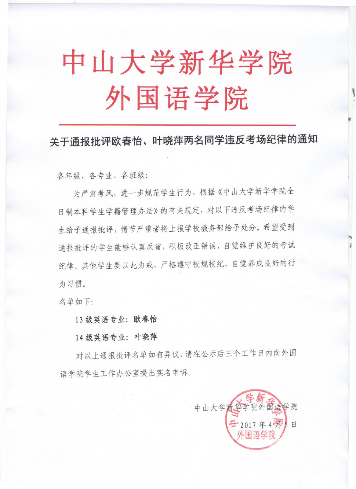 关于通报批评欧春怡、叶晓萍两位同学违反考场纪律的通知